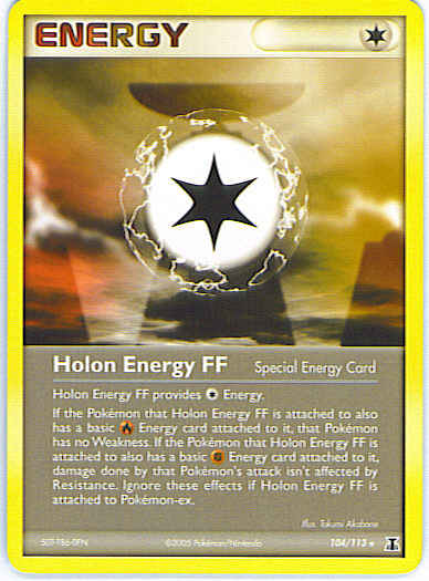 Holon Energy FF provides C Energy. If the Pokemon that Holon Energy FF is attached to also has a basic R Energy card attached to it, that Pokemon has no Weakness. If the Pokemon that Holon Energy is attached to also has a basic F Energy card attached to it, damage done by that Pokemon's attack isn't affected by Resistance. Ignore these effects if Holon Energy FF is attached to Pokemon-ex.