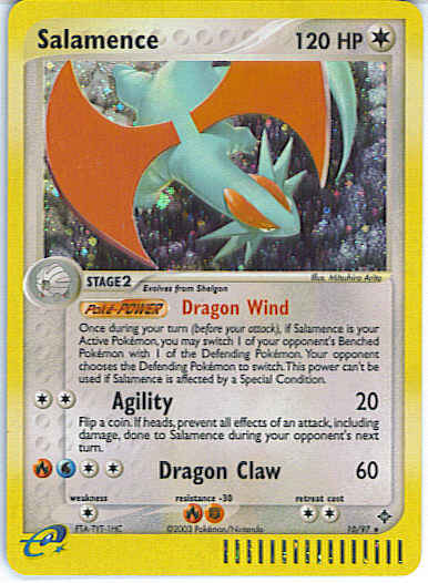| Type | Colorless | | Pokemon serie | Dragon | | Stadie | Stage 2 | | HP | 120 | | Sjældenhed | Rare | | Tilbagetrækning | 2 | | Modstand | FR | | Svaghed | C | | Kortnummer | 10 | | Evne |