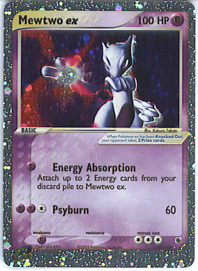 | Type | Psychic | | Pokemon serie | Ruby Sapphire | | Stadie | Basic | | HP | 100 | | Sjældenhed | Ultra-Rare | | Tilbagetrækning | 3 | | Svaghed | P | | Kortnummer | 101 | | Evne | [P] Energy Absorption - Attach up to 2 Energy cards from your discard pile to Mewtwo ex. [CPP] Psyburn (60)