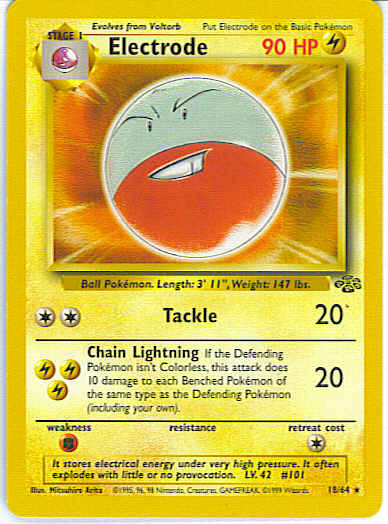 | Type | Lightning | | Pokemon serie | Jungle | | Stadie | Stage 1 | | HP | 90 | | Sjældenhed | Rare | | Tilbagetrækning | 1 | | Svaghed | F | | Kortnummer | 18 | | Evne |