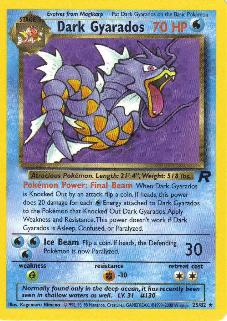 | Type | Water | | Pokemon serie | Team Rocket | | Stadie | Stage 1 | | HP | 70 | | Sjældenhed | Rare | | Tilbagetrækning | 2 | | Modstand | F | | Svaghed | G | | Kortnummer | 25 | | Evne |