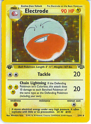 | Type | Lightning | | Pokemon serie | Jungle | | Stadie | Stage 1 | | HP | 90 | | Sjældenhed | Rare | | Tilbagetrækning | 1 | | Svaghed | F | | Kortnummer | 2 | | Evne |