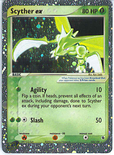 | Type | Grass | | Pokemon serie | Ruby Sapphire | | Stadie | Basic | | HP | 80 | | Sjældenhed | Ultra-Rare | | Tilbagetrækning | 1 | | Modstand | F | | Svaghed | R | | Kortnummer | 102 | | Evne | [G] Agility (10) Flip a coin. If heads, prevent all effects of an attack, including damage, done to Scyther ex during your opponent's next turn. [CGG] Slash (50)