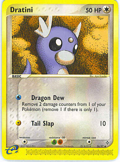 | Type | Colorless | | Pokemon serie | Dragon | | Stadie | Basic | | HP | 50 | | Sjældenhed | Uncommon | | Tilbagetrækning | 1 | | Modstand | FG | | Svaghed | C | | Kortnummer | 26 | | Evne | [W] Dragon Dew - Remove 2 damage counters from 1 of your Pokemon (remove 1 if there is only 1). [L] Tail Slap (10) | | Evne2 | [W] Dragon Dew - Remove 2 damage counters from 1 of your Pokemon (remove 1 if there is only 1). [L] Tail Slap (10) | | Kunstner | Aya Kusube |