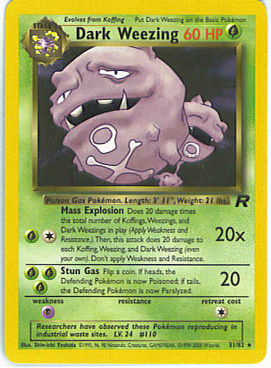 [CG] Mass Explosion (20x) Does 20 damage times the total number of Koffings, Weezings, and Dark Weezings in play (Apply Weakness and Resistance.). Then, this attack does 20 damage to each Koffing, Weezing, and Dark Weezing even your own). Don't apply Weakness and Resistance.