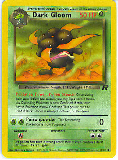 | Type | Grass | | Pokemon serie | Team Rocket | | Stadie | Stage 1 | | HP | 50 | | Sjældenhed | Uncommon | | Tilbagetrækning | 2 | | Svaghed | F | | Kortnummer | 36 | | Evne |