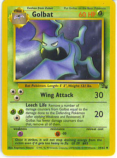 [CGG] Leech Life (20) Remove a number of damage counters from Golbat equal to the damage done to the Defending Pokemon (after applying Weakness and Resistance). If Golbat has fewer damage counters than that, remove all of them.