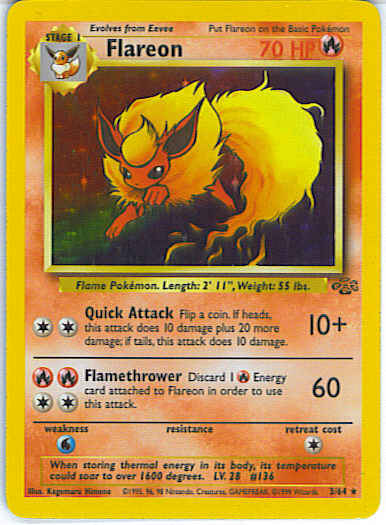 | Type | Fire | | Pokemon serie | Jungle | | Stadie | Stage 1 | | HP | 70 | | Sjældenhed | Rare | | Tilbagetrækning | 1 | | Svaghed | W | | Kortnummer | 3 | | Evne |