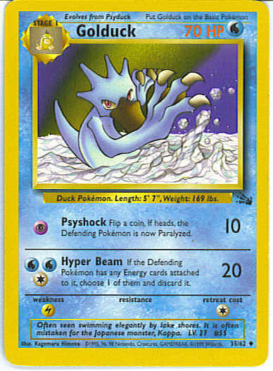 | Type | Water | | Pokemon serie | Fossil | | Stadie | Stage 1 | | HP | 70 | | Sjældenhed | Uncommon | | Tilbagetrækning | 1 | | Svaghed | L | | Kortnummer | 35 | | Evne |