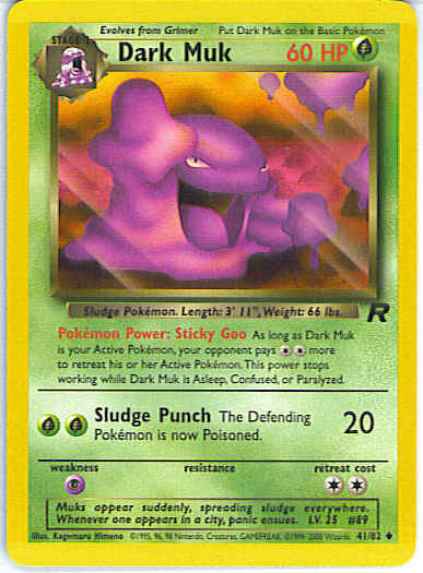 | Type | Grass | | Pokemon serie | Team Rocket | | Stadie | Stage 1 | | HP | 60 | | Sjældenhed | Uncommon | | Tilbagetrækning | 2 | | Svaghed | P | | Kortnummer | 41 | | Evne |