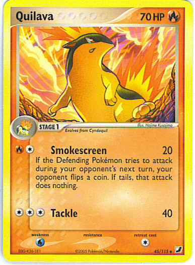 | Type | Fire | | Pokemon serie | Unseen Forces | | Stadie | Stage 1 | | HP | 70 | | Sjældenhed | Uncommon | | Tilbagetrækning | 1 | | Svaghed | W | | Kortnummer | 45 | | Evne | [CR] Smokescreen (20) If the Defending Pokemon tries to attack during your opponent's next turn, your opponent flips a coin. If tails, that attack does nothing. [CCC] Tackle (40) | | Evne2 | [CR] Smokescreen (20) If the Defending Pokemon tries to attack during your opponent's next turn, your opponent flips a coin. If tails, that attack does nothing. [CCC] Tackle (40) | | Kunstner | Hajime Kusajima |
