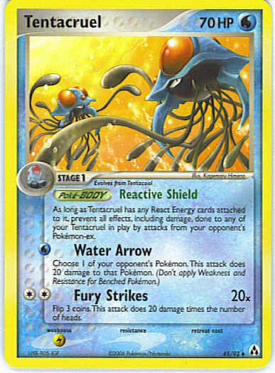 | Type | Water | | Pokemon serie | Legend Maker | | Stadie | Stage 1 | | HP | 70 | | Sjældenhed | Uncommon | | Svaghed | L | | Kortnummer | 45 | | Evne | , including damage, done to any of your Tentacruel in play by attacks from your opponent's Pokemon-ex. (Poke-BODY)