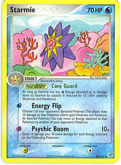 | Evne | [W] Energy Flip - Choose 1 of your opponent's Benched Pokemon. This attack does 10 damage to that Pokemon . (Don't apply Weakness and Resistance for Benched Pokemon.) You may move any Energy attached to that Pokemon to another of your opponent's Pokemon. [P] Psychic Boom (10+) Does 10 damage plus 10 more damage for each Energy attached to the Defending Pokemon. |