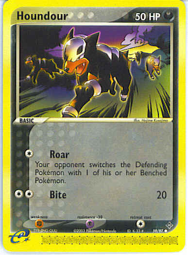 | Type | Darkness | | Pokemon serie | Dragon | | Stadie | Basic | | HP | 50 | | Sjældenhed | Common | | Tilbagetrækning | 1 | | Modstand | P | | Svaghed | F | | Kortnummer | 59 | | Evne | [C] Roar - Your opponent switches the Defending Pokemon with 1 of his or her Benched Pokemon. [CC] Bite (20) | | Evne2 | [C] Roar - Your opponent switches the Defending Pokemon with 1 of his or her Benched Pokemon. [CC] Bite (20) | | Kunstner | Hajime Kusajima |