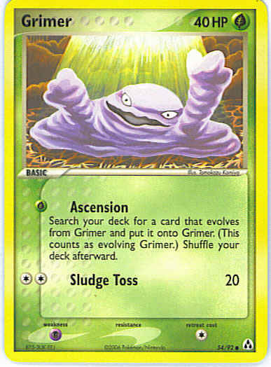 | Type | Grass | | Pokemon serie | Legend Maker | | Stadie | Basic | | HP | 40 | | Sjældenhed | Common | | Tilbagetrækning | 1 | | Svaghed | P | | Kortnummer | 54 | | Evne | [G] Ascension - Search you deck for a card that evolves from Grimer and put it onto Grimer. (This counts as evolving Grimer). Shuffle your deck afterward. [CC] Sludge Toss (20) | | Evne2 | [G] Ascension - Search you deck for a card that evolves from Grimer and put it onto Grimer. (This counts as evolving Grimer). Shuffle your deck afterward. [CC] Sludge Toss (20) | | Kunstner | Tomokazu Komiya |