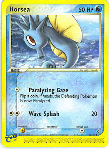 | Type | Water | | Pokemon serie | Dragon | | Stadie | Basic | | HP | 50 | | Sjældenhed | Common | | Tilbagetrækning | 1 | | Svaghed | L | | Kortnummer | 58 | | Evne | [C] Paralyzing Gaze - Flip a coin. If heads, the Defending Pokemon is now Paralyzed. [CC] Wave Splash (20) | | Evne2 | [C] Paralyzing Gaze - Flip a coin. If heads, the Defending Pokemon is now Paralyzed. [CC] Wave Splash (20) | | Kunstner | Midori Harada |
