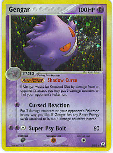[P] Cursed Reaction - Put 2 damage counters on your opponent's Pokemon in any way you like. If Gengar has any React Energy attached to it, put 4 damage counters instead.