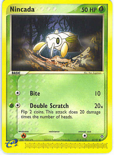 | Type | Grass | | Pokemon serie | Dragon | | Stadie | Basic | | HP | 50 | | Sjældenhed | Common | | Tilbagetrækning | 1 | | Svaghed | R | | Kortnummer | 67 | | Evne | [C] Bite (10) [CG] Double Scratch (20x) Flip 2 coins. This attack does 20 damage times the number of heads. | | Evne2 | [C] Bite (10) [CG] Double Scratch (20x) Flip 2 coins. This attack does 20 damage times the number of heads. | | Kunstner | Ken Sugimori |