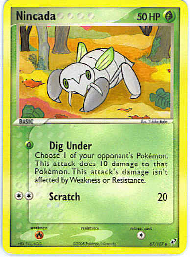 | Type | Grass | | Pokemon serie | Deoxys | | Stadie | Basic | | HP | 50 | | Sjældenhed | Common | | Tilbagetrækning | 1 | | Svaghed | R | | Kortnummer | 67 | | Evne | [G] Dig Under - Choose 1 of your opponent's Pokemon. This attack does 10 damage to that Pokemon. This attack's damage isn't affected by Weakness or Resistance. [CC] Scratch (20) | | Evne2 | [G] Dig Under - Choose 1 of your opponent's Pokemon. This attack does 10 damage to that Pokemon. This attack's damage isn't affected by Weakness or Resistance. [CC] Scratch (20) | | Kunstner | Yukiko Baba |