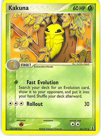 | Type | Grass | | Pokemon serie | Delta Species | | Stadie | Stage 1 | | HP | 60 | | Sjældenhed | Uncommon | | Tilbagetrækning | 2 | | Svaghed | R | | Kortnummer | 46 | | Evne | [G] Fast Evolution - Search your deck for an Evolution card, show it to your opponent, and put it into your hand. Shuffle your deck afterward. [CCC] Rollout (30) | | Evne2 | [G] Fast Evolution - Search your deck for an Evolution card, show it to your opponent, and put it into your hand. Shuffle your deck afterward. [CCC] Rollout (30) | | Kunstner | Sachiko Adachi |
