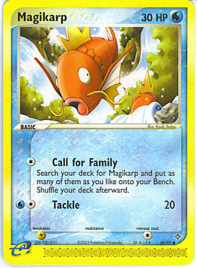 | Type | Water | | Pokemon serie | Dragon | | Stadie | Basic | | HP | 30 | | Sjældenhed | Common | | Tilbagetrækning | 1 | | Svaghed | L | | Kortnummer | 60 | | Evne | [C] Call for Family - Search your deck for Magikarp and put as many as you like onto your Bench. Shuffle your deck afterward. [CW] Tackle (20) | | Evne2 | [C] Call for Family - Search your deck for Magikarp and put as many as you like onto your Bench. Shuffle your deck afterward. [CW] Tackle (20) | | Kunstner | Kouki Saitou |