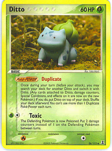 | Type | Grass | | Pokemon serie | Delta Species | | Stadie | Basic | | HP | 60 | | Sjældenhed | Uncommon | | Tilbagetrækning | 1 | | Svaghed | R | | Kortnummer | 36 | | Evne | on it are now on the new Pokemon.) If you do, put Ditto on top of your deck. Shuffle your deck afterward. You can't use more than 1 Duplicate Poke-Power each turn. (Poke-POWER)