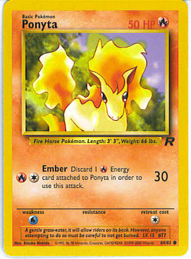 | Type | Fire | | Pokemon serie | Team Rocket | | Stadie | Basic | | HP | 50 | | Sjældenhed | Common | | Tilbagetrækning | 1 | | Svaghed | W | | Kortnummer | 64 | | Evne |