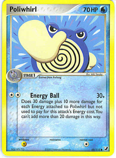 | Type | Water | | Pokemon serie | Unseen Forces | | Stadie | Stage 1 | | HP | 70 | | Sjældenhed | Common | | Tilbagetrækning | 1 | | Svaghed | L | | Kortnummer | 68 | | Evne | [CC] Energy Ball (30+) Does 30 damage plus 10 more damage for each Energy attached to Poliwhirl but not used to pay for this attack's Energy cost. You can't add more than 20 damage in this way. | | Evne2 | [CC] Energy Ball (30+) Does 30 damage plus 10 more damage for each Energy attached to Poliwhirl but not used to pay for this attack's Energy cost. You can't add more than 20 damage in this way. | | Kunstner | Miki Tanaka |