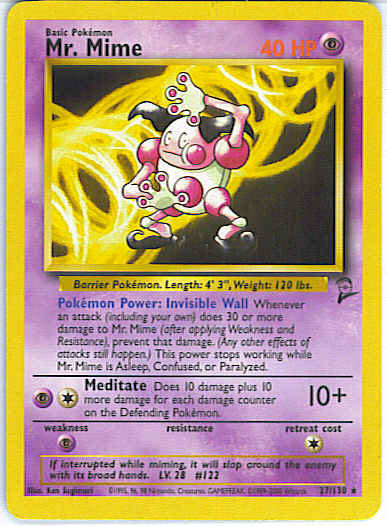 | Type | Psychic | | Pokemon serie | Base Set 2 | | Stadie | Basic | | HP | 40 | | Sjældenhed | Rare | | Tilbagetrækning | 1 | | Svaghed | P | | Kortnummer | 27 | | Evne | of attacks still happen.) This power can't be used if Mr. Mime is Asleep, Confused, or Paralyzed.