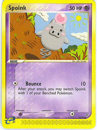| Type | Psychic | | Pokemon serie | Dragon | | Stadie | Basic | | HP | 50 | | Sjældenhed | Common | | Tilbagetrækning | 1 | | Svaghed | P | | Kortnummer | 73 | | Evne | [C] Bounce (10) After your attack, you may switch Spoink with 1 of your Benched Pokemon. | | Evne2 | [C] Bounce (10) After your attack, you may switch Spoink with 1 of your Benched Pokemon. | | Kunstner | Miki Tanaka |