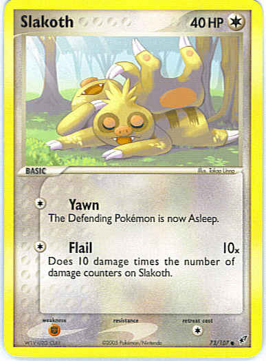 | Type | Colorless | | Pokemon serie | Deoxys | | Stadie | Basic | | HP | 40 | | Sjældenhed | Common | | Tilbagetrækning | 1 | | Svaghed | F | | Kortnummer | 73 | | Evne | [C] Yawn - The Defending Pokemon is now Asleep. [C] Flail (10x) Does 10 damage times the number of damage counters on Slakoth. | | Evne2 | [C] Yawn - The Defending Pokemon is now Asleep. [C] Flail (10x) Does 10 damage times the number of damage counters on Slakoth. | | Kunstner | Takao Unno |