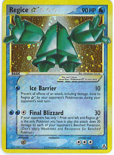 [CWW] Final Blizzard (30) If your opponent has only 1 Prize card left and Regice * is the only Pokemon you have in play, this attack does 30 damage to each of your opponent's Benched Pokemon. (Don't apply Weakness and Resistance for Benched Pokemon.)