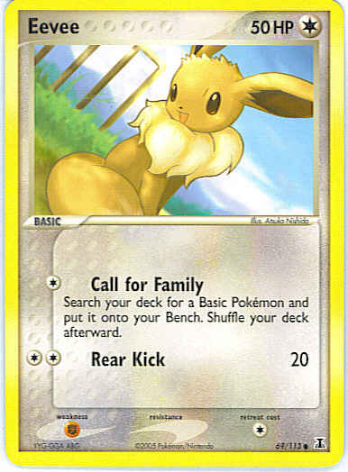 | Type | Colorless | | Pokemon serie | Delta Species | | Stadie | Basic | | HP | 50 | | Sjældenhed | Common | | Tilbagetrækning | 1 | | Svaghed | F | | Kortnummer | 69 | | Evne | [C] Call for Family - Search your deck for a Basic Pokemon and put it onto your Bench. Shuffle your deck afterward. [CC] Rear Kick (20) | | Evne2 | [C] Call for Family - Search your deck for a Basic Pokemon and put it onto your Bench. Shuffle your deck afterward. [CC] Rear Kick (20) | | Kunstner | Atsuko Nishida |