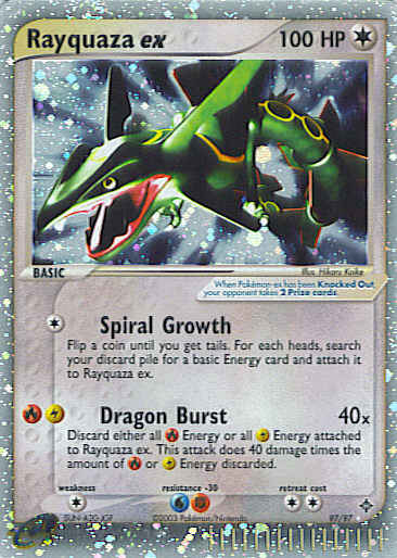 | Type | Colorless | | Pokemon serie | Dragon | | Stadie | Basic | | HP | 100 | | Sjældenhed | Ultra-Rare | | Tilbagetrækning | 2 | | Modstand | FW | | Svaghed | C | | Kortnummer | 97 | | Evne | [C] Spiral Growth - Flip a coin until you get tails. For each heads, search your discard pile for a basic Energy card and attach it to Rayquaza ex. [LR] Dragon Burst (40x) Discard either all R Energy or all L Energy attached to Rayquaza ex. This attack does 40 damage times the amount of R or L Energy discarded. | | Evne2 | [C] Spiral Growth - Flip a coin until you get tails. For each heads, search your discard pile for a basic Energy card and attach it to Rayquaza ex. [LR] Dragon Burst (40x) Discard either all R Energy or all L Energy attached to Rayquaza ex. This attack does 40 damage times the amount of R or L Energy discarded. | | Kunstner | Hikaru Koike |