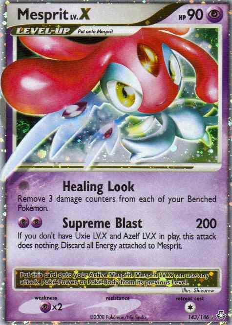 [PP] Supreme Blast (200) If you don't have Uxie LV.X and Azelf LV.X in play, this attack does nothing. Discard all Energy attached to Mesprit.