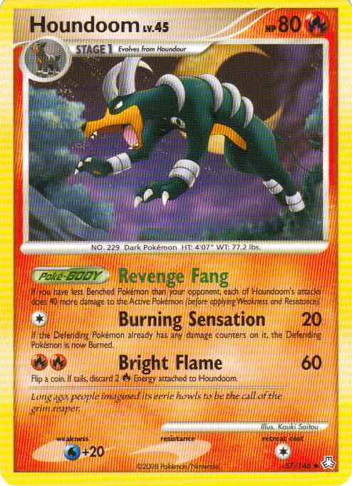 | | Evne2 | [C] Burning Sensation (20) If the Defending Pokemon already has any damage counters on it, the Defending Pokemon is now Burned. [RR] Bright Flame (60) Flip a coin. If tails, discard 2 R Energy attached to Houndoom.
