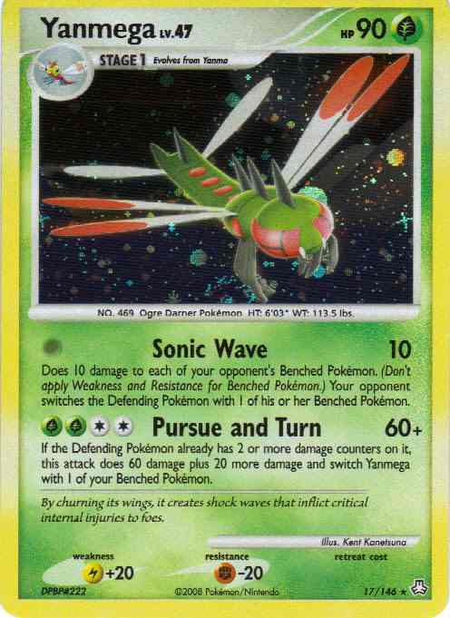 | | Evne2 | [0] Sonic Wave (10) Does 10 damage to each of your opponent's Benched Pokemon. (Don't apply Weakness and Resistance for Benched Pokemon.) Your opponent switches the Defending Pokemon with 1 of his or her Benched Pokemon. [CCGG] Pursue and Turn (60+) If the Defending Pokemon already has 2 or more damage counters on it, this attack does 60 damage plus 20 more damage and switch Yanmega with 1 of your Benched Pokemon.