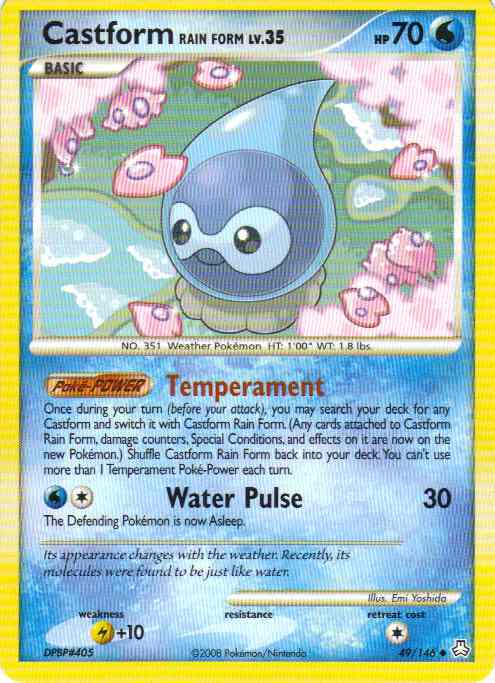 | | Evne2 | on it are now on the new Pokemon.) Shuffle Castform Rain Form back into your deck. You can't use more than 1 Temperament Poke-Power each turn. (Poke-POWER)