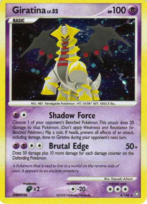 [CP] Shadow Force - Choose 1 of your opponent's Benched Pokemon. This attack does 20 damage to that Pokemon. (Don't apply Weakness and Resistance for Benched Pokemon.) Flip a coin. If heads, prevent all effects of an attack, including damage, done to Giratina during your opponent's next turn.
