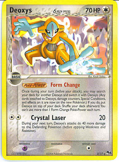 | Type | Colorless | | Pokemon serie | OP Series 4 | | Stadie | Basic | | HP | 70 | | Sjældenhed | Rare | | Tilbagetrækning | 1 | | Svaghed | P | | Kortnummer | 2 | | Evne | on it are now on the new Pokemon.) If you do, put Deoxys on top of your deck. Shuffle your deck afterward. You can't use more than 1 Form Change Poke-Power each turn. (Poke-POWER)