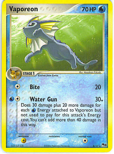 [CL] Water Gun (30+) Does 30 damage plus 20 more damage for each W Energy attached to Vaporeon but not used to pay for this attack's Energy cost. You can't add more than 40 damage in this way.