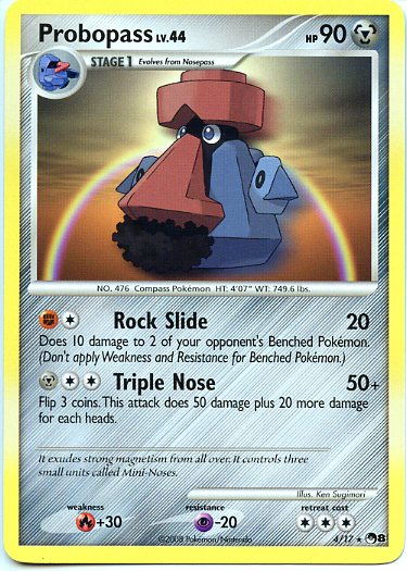 | Type | Metal | | Pokemon serie | OP Series 8 | | Stadie | Stage 1 | | HP | 90.0 | | Sjældenhed | Rare | | Tilbagetrækning | 3.0 | | Modstand | P-20 | | Svaghed | R+30 | | Kortnummer | 4 | | Evne | [CF] Rock Slide (20) Does 10 damage to 2 of your opponent's Benched Pokemon. (Don't apply Weakness and Resistance for Benched Pokemon.) [CCM] Triple Nose (50+) Flip 3 coins. This attack does 50 damage plus 20 more damage for each heads.