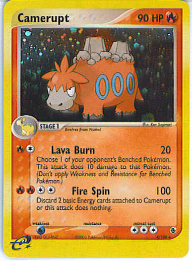 | Type | Fire | | Pokemon serie | Ruby Sapphire | | Stadie | Stage 1 | | HP | 90 | | Sjældenhed | Rare | | Tilbagetrækning | 3 | | Svaghed | W | | Kortnummer | 4 | | Evne | [CR] Lava Burn (20) Choose one of your opponent's Benched Pokemon. This attack does 10 damage to that Pokemon. (Don't apply weakness and resistance for Benched Pokemon.) [CCRR] Fire Spin (100) Discard 2 Basic Energy cards attached to Camerupt or this attack does nothing.