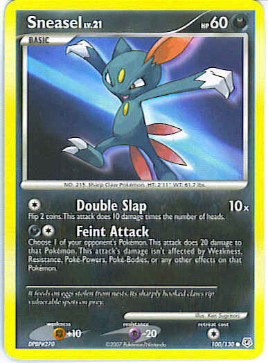 | Type | Darkness | | Pokemon serie | Diamond and Pearl | | Stadie | Basic | | HP | 60 | | Sjældenhed | Common | | Tilbagetrækning | 1 | | Modstand | P-20 | | Svaghed | F+10 | | Kortnummer | 100 | | Evne |
