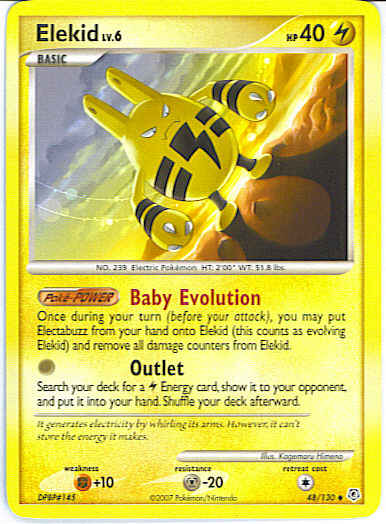 | Type | Lightning | | Pokemon serie | Diamond and Pearl | | Stadie | Basic | | HP | 40 | | Sjældenhed | Uncommon | | Tilbagetrækning | 1 | | Modstand | M-20 | | Svaghed | F+10 | | Kortnummer | 48 | | Evne |