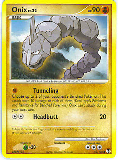 [F] Tunneling - Choose up to 2 of your opponent's Benched Pokemon. This attack does 10 damage to each of them. (Don't apply Weakness and Resistance for Benched Pokemon.) Onix can't attack during your next turn.