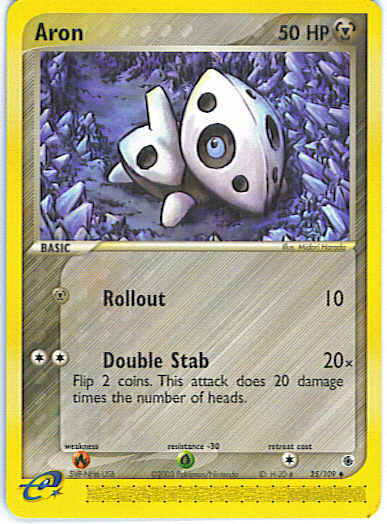 | Type | Metal | | Pokemon serie | Ruby Sapphire | | Stadie | Basic | | HP | 50 | | Sjældenhed | Uncommon | | Tilbagetrækning | 1 | | Svaghed | R | | Kortnummer | 25 | | Evne | [M] Rollout (10) [CC] Double Stab (20x) Flip 2 coins. This attack does 20 damage times the number of heads.