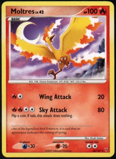 | Type | Fire | | Pokemon serie | Supreme Victors | | Stadie | Basic | | HP | 100 | | Sjældenhed | Rare | | Tilbagetrækning | 2 | | Modstand | F-20 | | Svaghed | W+30 | | Kortnummer | 36 | | Evne |