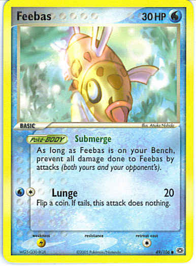 | Type | Water | | Pokemon serie | Emerald | | Stadie | Basic | | HP | 30 | | Sjældenhed | Common | | Tilbagetrækning | 1 | | Svaghed | L | | Kortnummer | 49 | | Evne | [CW] Lunge (20) Flip a coin. If tails, this attack does nothing. | | Evne2 | [CW] Lunge (20) Flip a coin. If tails, this attack does nothing. | | Kunstner | Atsuko Nishida |