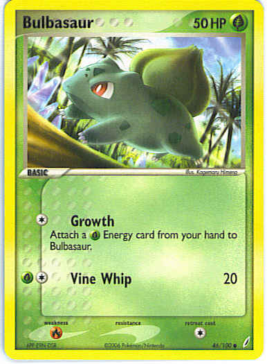 | Type | Grass | | Pokemon serie | Crystal Guardians | | Stadie | Basic | | HP | 50 | | Sjældenhed | Common | | Tilbagetrækning | 1 | | Svaghed | R | | Kortnummer | 46 | | Evne | [C] Growth - Attach a G Energy card from your hand to Bulbasaur. [CG] Vine Whip (20) | | Evne2 | [C] Growth - Attach a G Energy card from your hand to Bulbasaur. [CG] Vine Whip (20) | | Kunstner | Kagemaru Himeno |